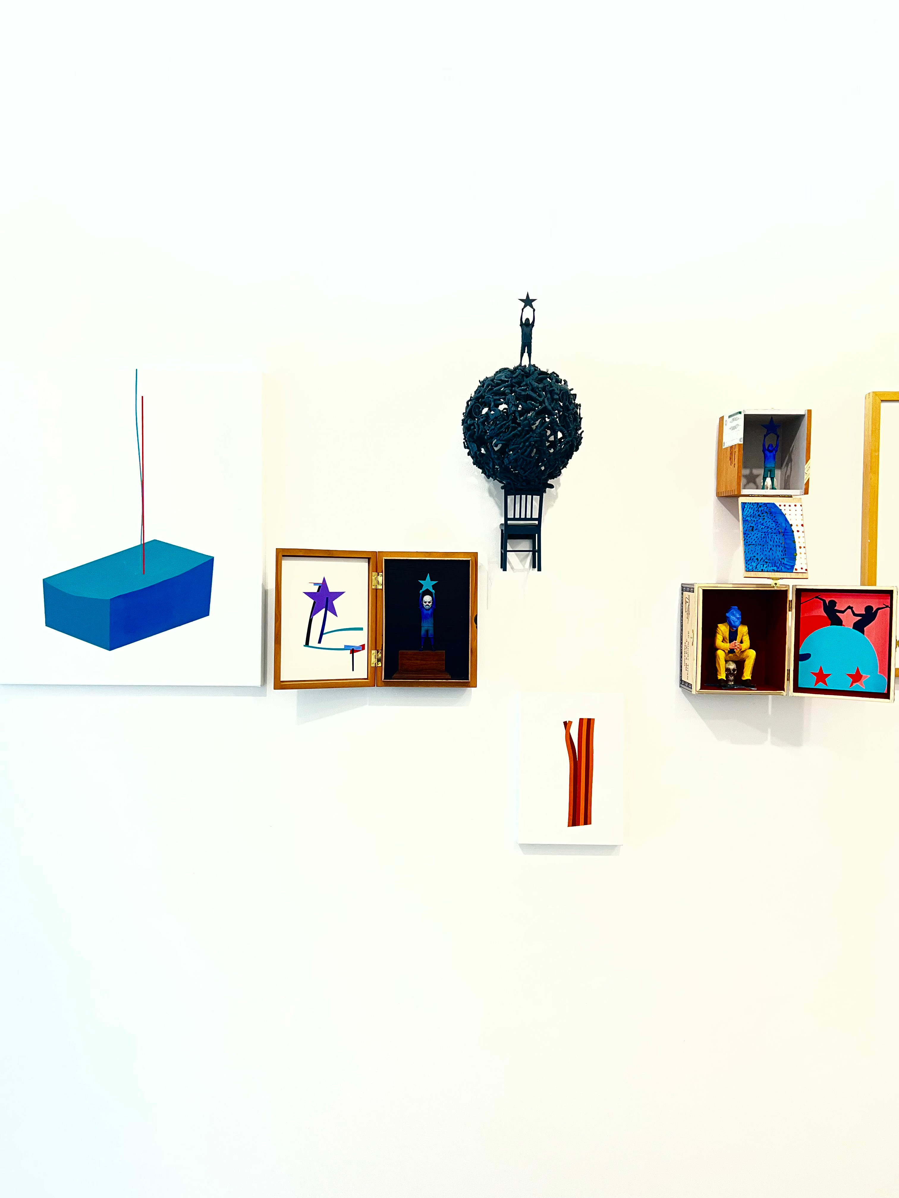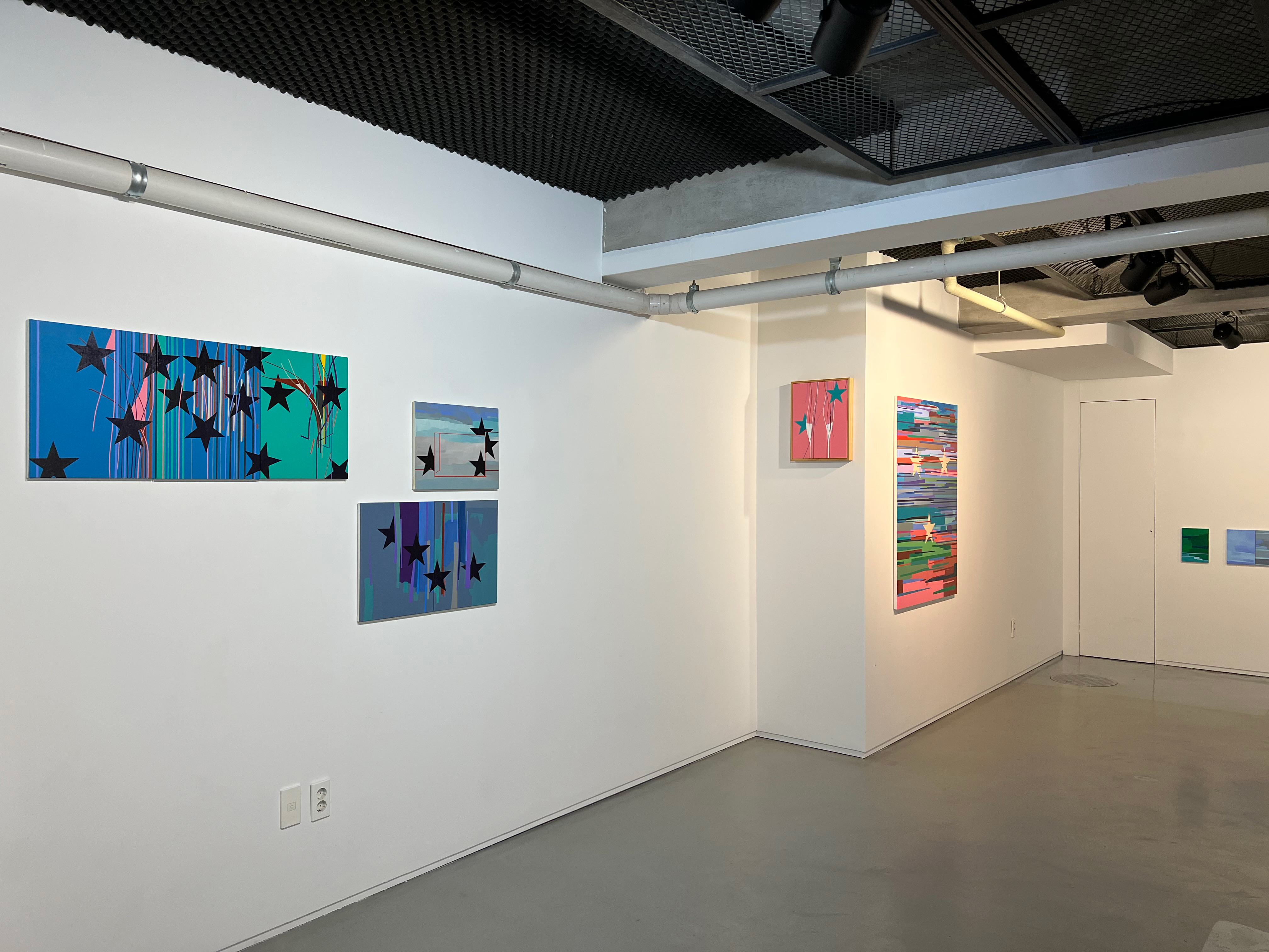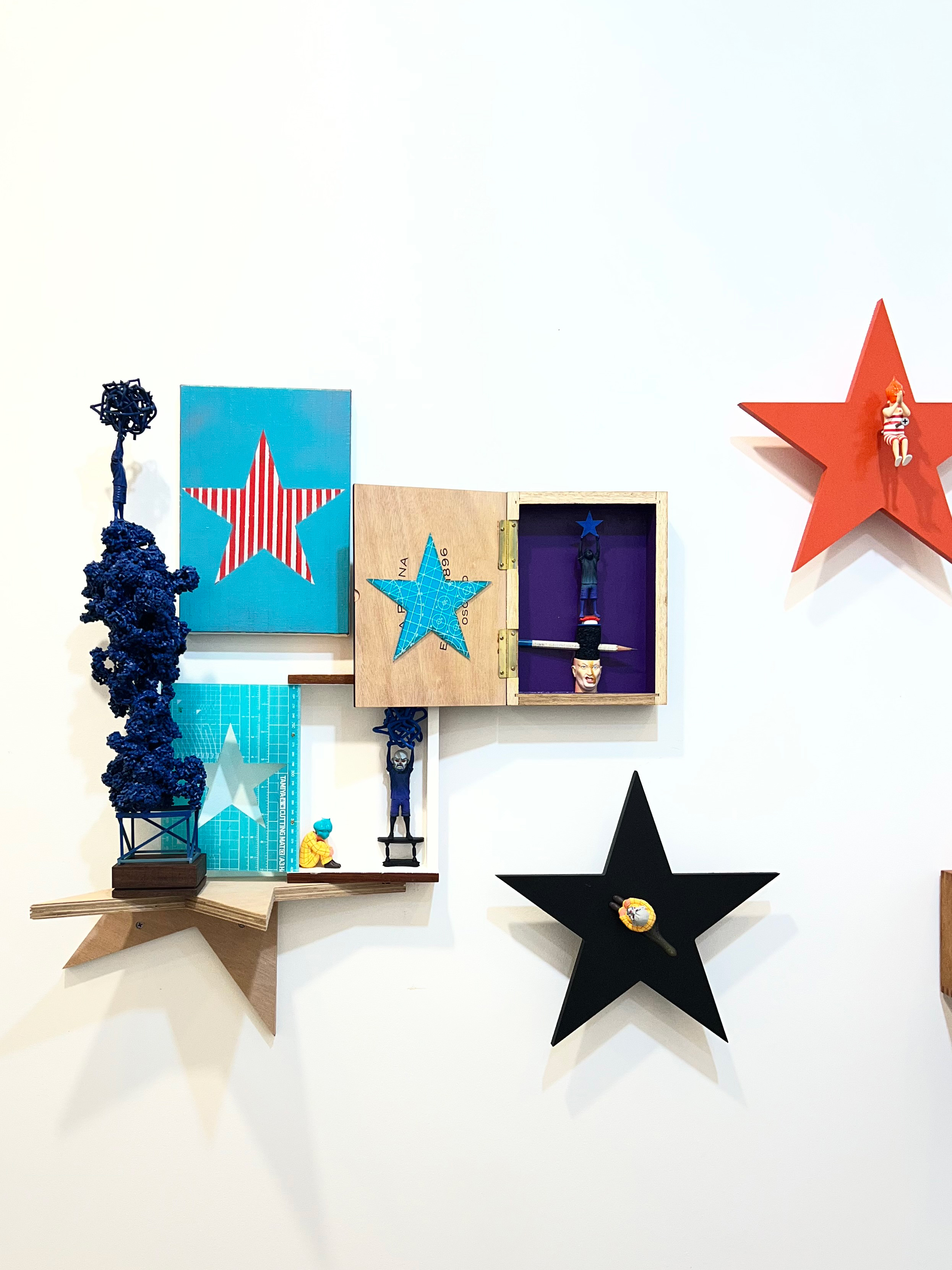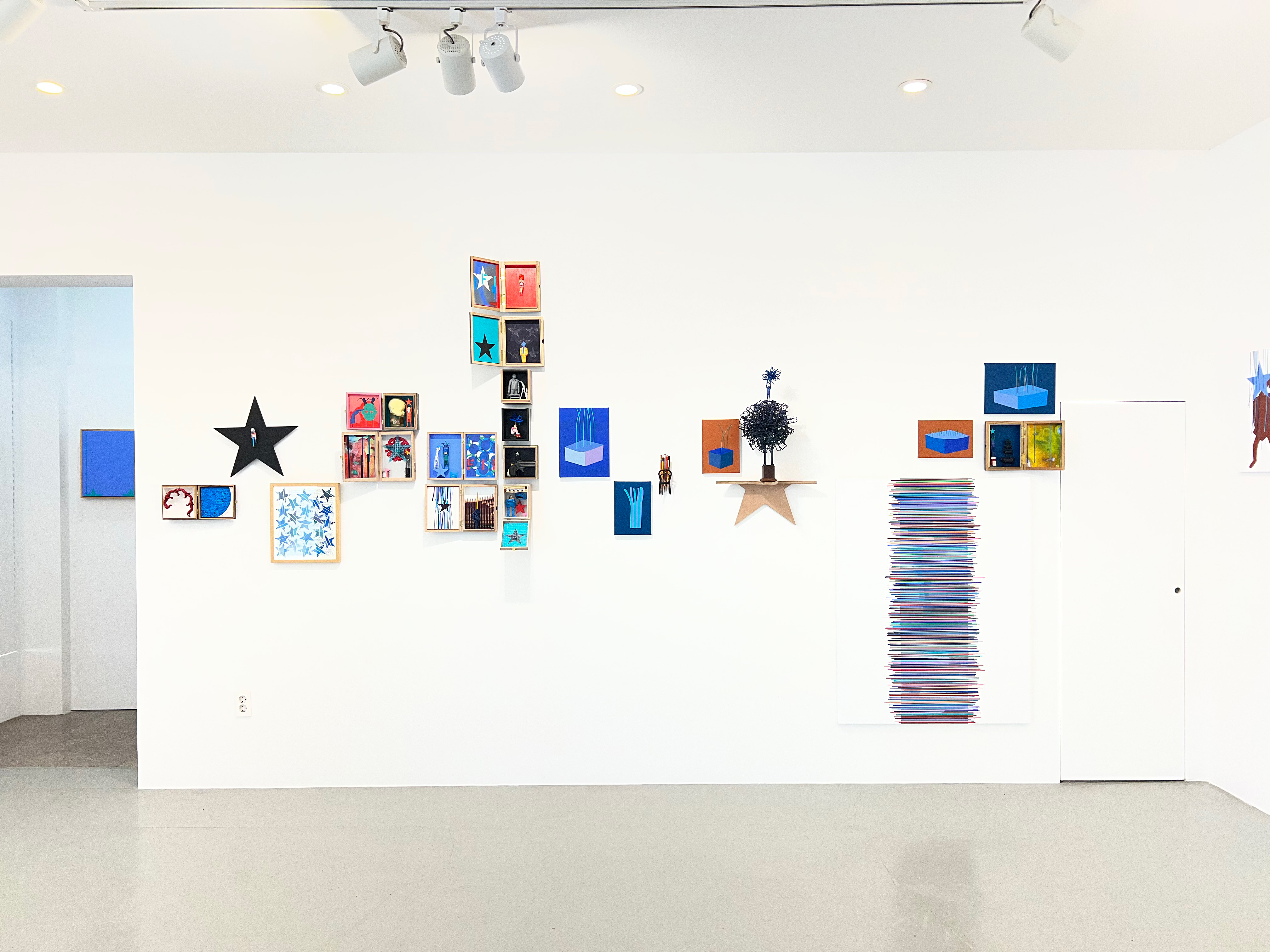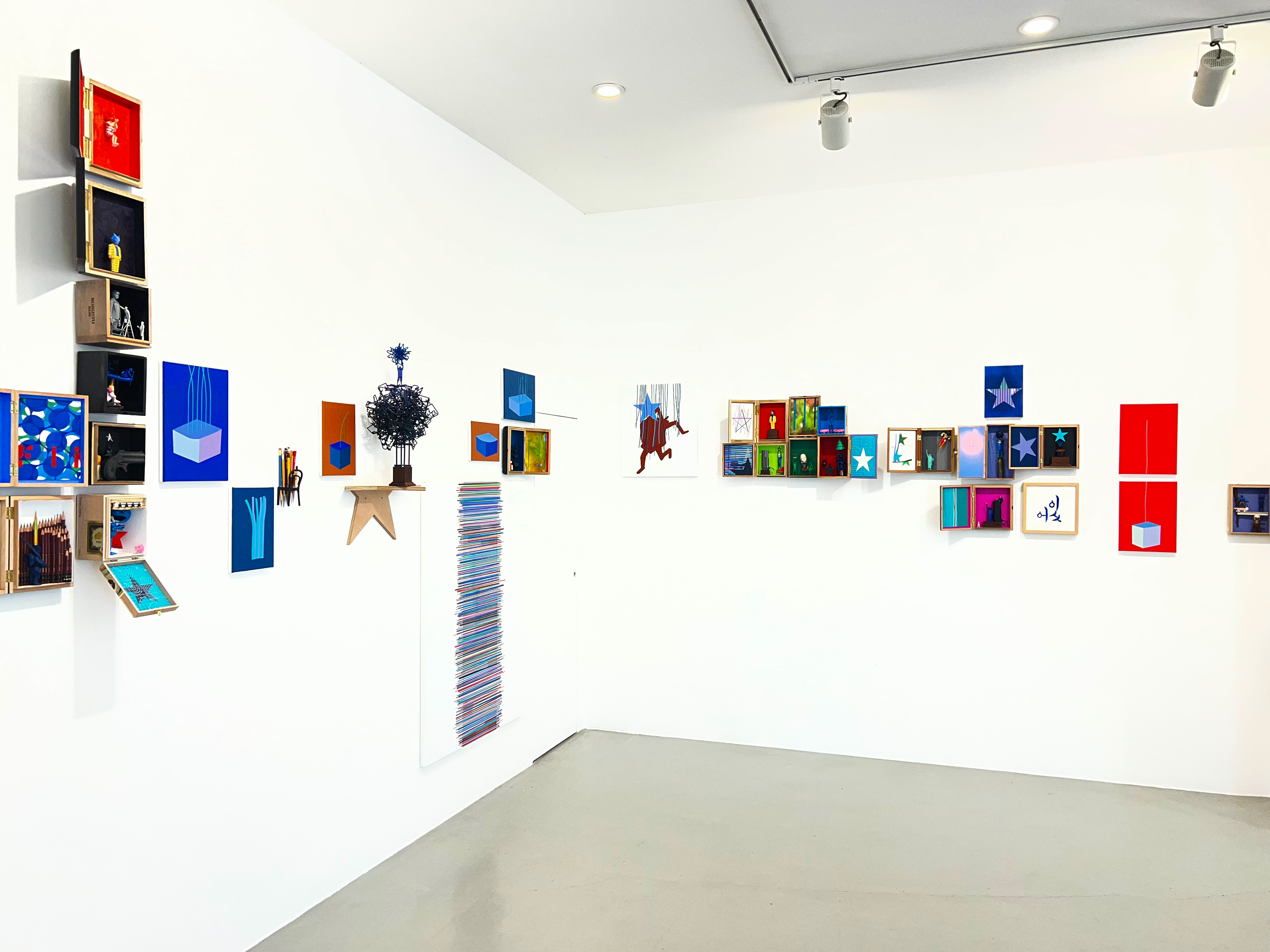 시가 박스의 펼쳐진 뚜껑 안쪽에는 평면 작업이 연결된다. 그리고 여러 박스 사이 사이에 ‘별세우기’ 조형물이나 선(line)과 별을 주제로 한 평면 작업이 선보인다. 마치 연극의 1막 다음